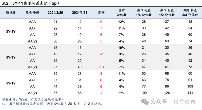 2月 3Y-1Y期限利差走扩,5Y-3Y期限利差小幅收窄。其中,各评级3Y-1Y期限利差走扩5-9bp;AA及以上评级5Y-3Y期限利差收窄1-2bp,AA(2) 5Y-3Y期限利差收窄13bp。截至2月29日,城投债3Y-1Y期限利差分位数处于2018年以来4%-12%历史较低水平,5Y-3Y期限利差分位数也处于3%-10%较低位。