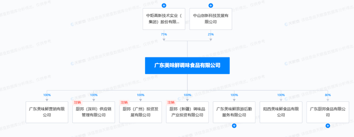 再来看此次被举报的两家核心子公司“美味鲜调味”与“厨邦食品”,美味鲜调味持有厨邦食品80%股权。中炬高新直接与间接持有美味鲜调味100%的股权。