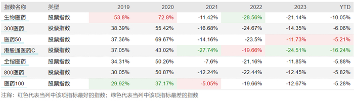 以下为近5年来,各大医药指数的年度表现情况。2019年和2020年的医药牛市行情中,生物医药指数一马当先,分别大涨53.8%和72.8%;2021年,医药100指数表现最为抗跌,年度跌幅仅为5.05%;2022年,港股通医药指数跌幅最小;2023年和2024年最为抗跌的则均为医药50指数。