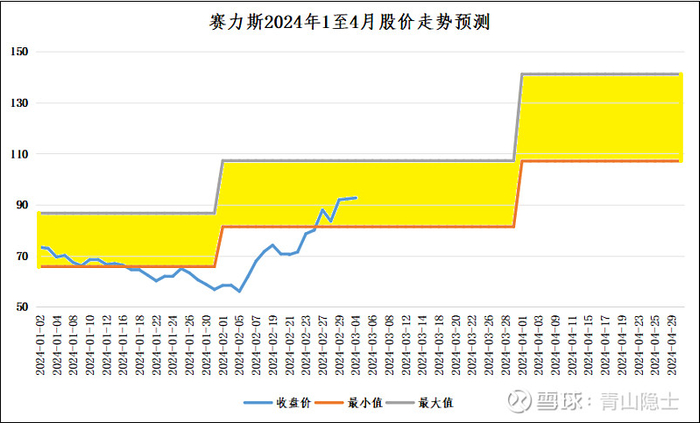 1月10日,我基于赛力斯问界的月销量预测值,给出了赛力斯2024年1至4月的股价走势(如下图)。1月的价格走廊下限为65.78元/股,上限为86.67元/股;2至3月的价格走廊下限为81.38元/股,上限为107.22元/股;4月的价格走廊下限为107.10元/股,上限为141.11元/股。