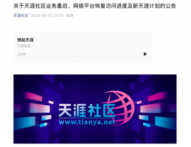 3月1日深夜11时,天涯社区在官方微信公众号上发布了《关于天涯社区业务重启、网络平台恢复访问进度及新天涯计划的公告》,宣布未来两个月,以天涯社区恢复访问为核心目标的业务自救将全面展开。