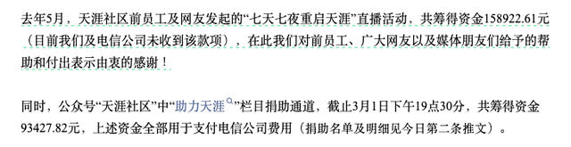 至于原因,邢明向红星资本局表示,去年的直播筹款由天涯前员工老黑和他的直播合作伙伴扶苏发起,但扶苏遇到了一些财务状况,这笔钱一直没有付给电信。