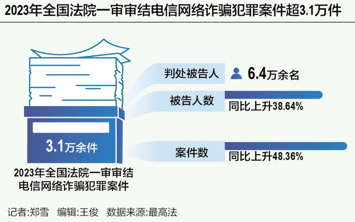陈鸿翔:人民法院充分发挥审判职能作用,坚持依法从严惩处、全链条纵深打击,2023年全国法院一审审结电信网络诈骗犯罪案件3.1万余件,判处被告人6.4万余名,案件数和被告人数同比分别上升48.36%、38.64%。