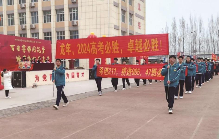高三的同学们接过战旗,庄严宣誓。全校师生都在为高三学子们呐喊助威,希望他们带着家长的殷切希望,带着老师的真诚祝福,带着破釜沉舟、卧薪尝胆的气势,拿出智慧和毅力,用100天给自己一个机会,用100天为自己创造一个奇迹,努力到无能为力,奋斗到感动自己,用拼搏与汗水夺取2024高考的胜利。靳瑞芳 张浩楠