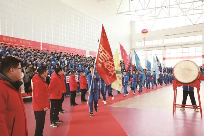 国旗队、旗林队、舞狮舞龙、条幅方阵、教师方阵、各班方阵陆续入场,在激昂的国歌中,百日誓师仪式正式开始。