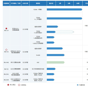 目前,派格生物拥有一款处于NDA阶段的GLP-1产品PB-119,以及另外五款处于临床阶段及临床前的在研产品,主要适应症覆盖2型糖尿病(T2DM)、肥胖症、非酒精性脂肪性肝炎(“NASH”)、阿片类药物引起的便秘(“OIC”)及先天性高胰岛素血症等常见慢病及代谢疾病。