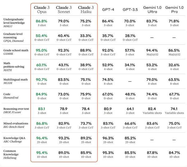 Claude 3 模型与同行大模型在行业基准测试中的表现