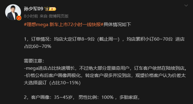 结合场均大定订单数据来看,MEGA上市72小时的大定订单,大约就在3000台出头,和此前“新渠道-李霸天”发布的消息吻合。