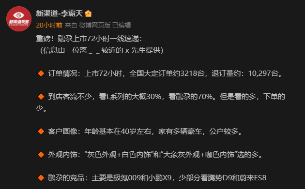 以上市72小时为统计周期,MEGA的全国大定订单约为3218台,小订退订量为10297台,用户画像以40岁的豪车用户为主。