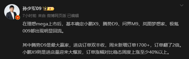 其中,腾势D9周末新增1700张以上的订单,直接翻了两倍;小鹏X9的订单跟以往相比也有40%以上的涨幅。