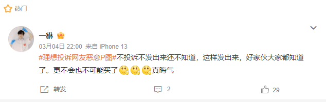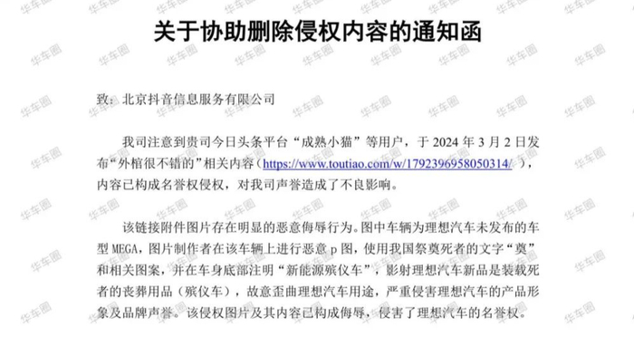3月4日,理想汽车官方向平台举报了制作该图的博主,称其“严重侵害理想汽车的产品形象及品牌声誉,已构成侮辱”,并已要求平台删除相关内容。