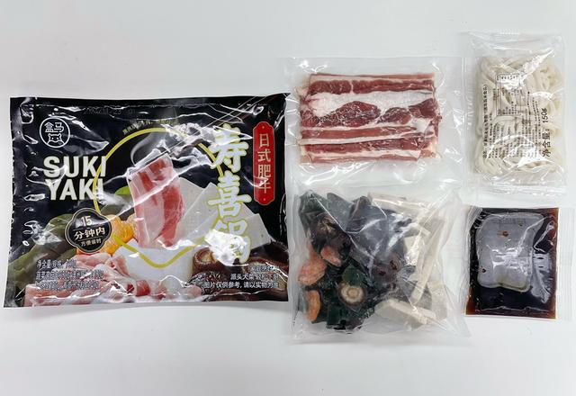 所见即所得,肥牛片肉大、肉较厚、肉较多,是第一印象。吃得出来肥牛片的品质在线。寿喜锅汤汁的味道香浓微甜,很地道。海带结、黑木耳、千叶豆腐,甚至乌冬面的口感,也跟下馆子吃到的基本没差别。要说唯一的问题,就是千叶豆腐过多,商家或可考虑增加其他素菜替代。
