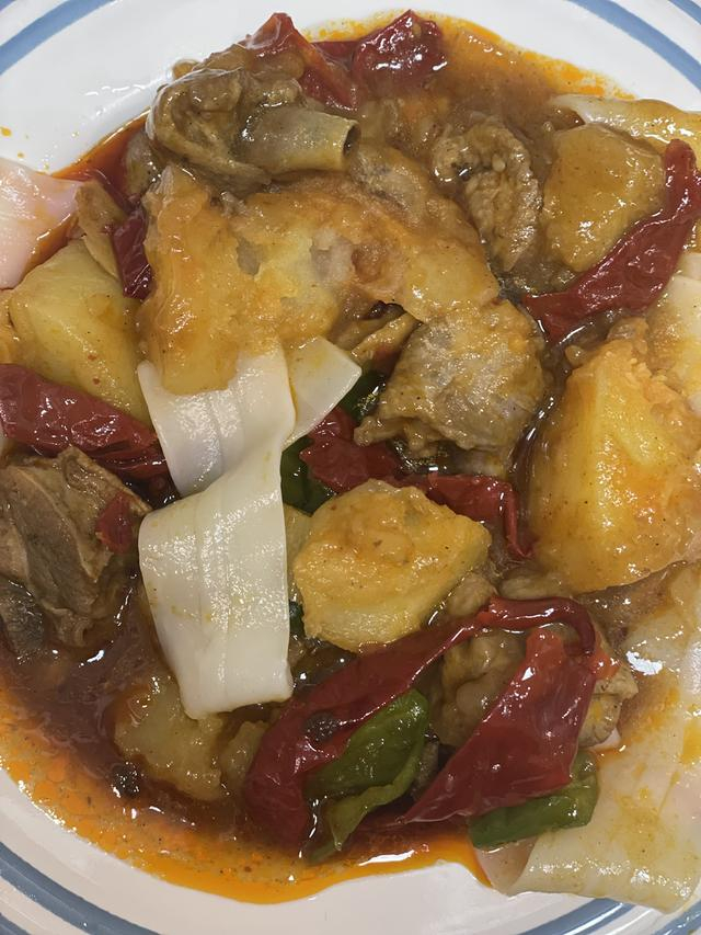 1斤半的大盘鸡,份量很足!鸡肉都是肉眼可见的大块,没有用边角料。调味也适中,宽面裹了酱汁味道更佳。总体来说,这份大盘鸡跟下馆子吃到的区别不大,只是搭配的土豆稍微有点过于软烂。