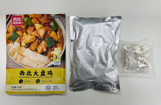 烹饪时步骤简单,但时间有点长,需近20分钟,亲测建议用2个锅操作:①、把适量水倒进A锅中煮沸;②、拆掉外包装袋,取出内袋(为食品锁鲜袋,无需拆袋),将内袋放入A锅沸水中加热近20分钟,捞出拆袋将大盘鸡倒入大碗中;③、宽面包拆袋,在B锅沸水中煮1.5分钟,捞出放入大盘鸡大碗中,即可食用。
