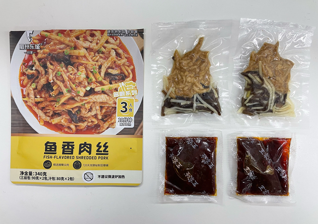 在预制菜领域深耕多年的眉州东坡,致力于让川菜文化走向世界。东坡肘子、一品东坡肉、东坡扣肉,他家一众耳熟能详的招牌产品都有预制菜版本。本次测评的鱼香肉丝,也是预制菜领域中的常见品类。