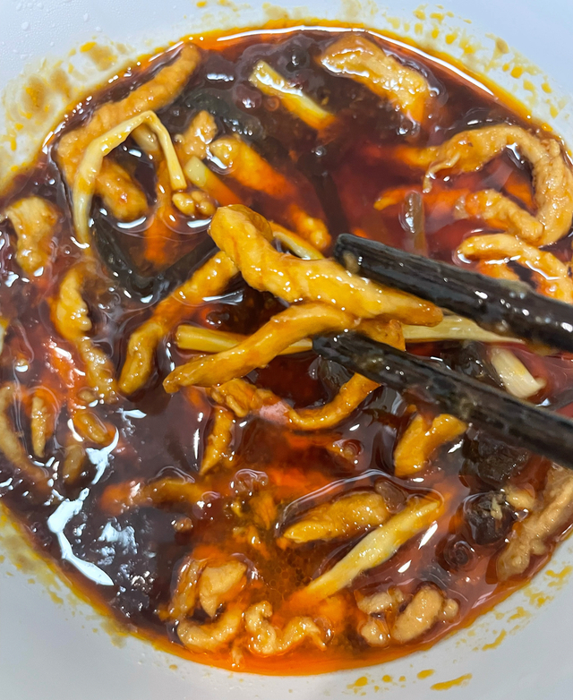 做好后,实图可见料汁比较足,其实放多半包即可。猪肉丝比较粗,形态也完整,但口感稍软绵了些。特色鱼香料汁的还原度较高。搭配的木耳丝、冬笋丝也都脆嫩入味。总体来说,算是还原了川菜鱼香肉丝这一味型。