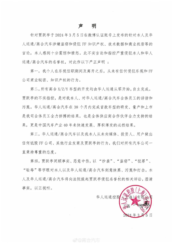 随后,华人运通、高合汽车创始人丁磊发布声明,针对贾跃亭于2024年3月5日在微博发布的针对本人及华人运通、高合汽车涉嫌盗窃和侵犯FF知识产权、技术数据和商业机密等的言论,感到十分震惊和愤怒。