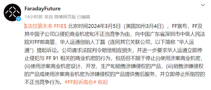 3月5日,法拉第未来也发布公告称,FF及其中国子公司以侵犯商业秘密和不正当竞争为由,向中国广东省深圳市中级人民法院对FF前高管、华人运通创始人丁磊提起诉讼。