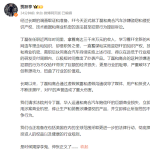 贾跃亭表示,正准备在包括美国在内的全球范围采取更进一步的法律行动,彻底捍卫FF和投资人的权益以及健康的行业规则。