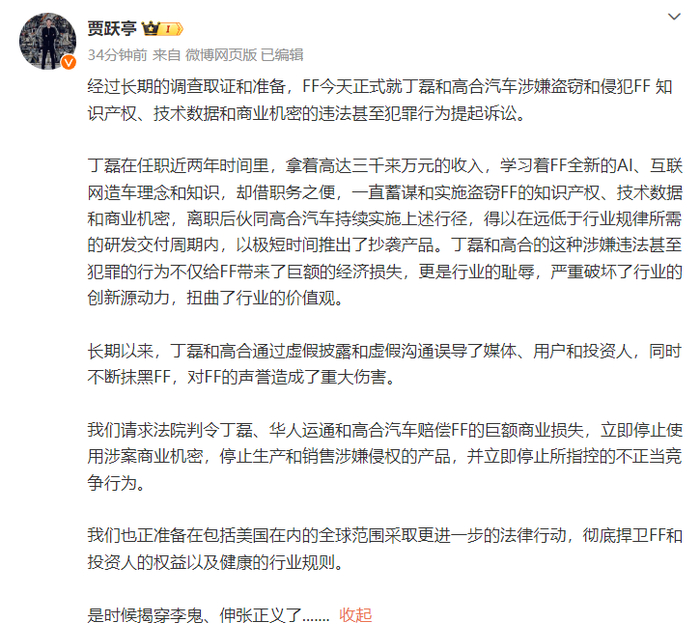 3月5日上午,贾跃亭微博发文表示,FF今天正式就丁磊和高合汽车涉嫌盗窃和侵犯FF知识产权、技术数据和商业机密的违法甚至犯罪行为提起诉讼。