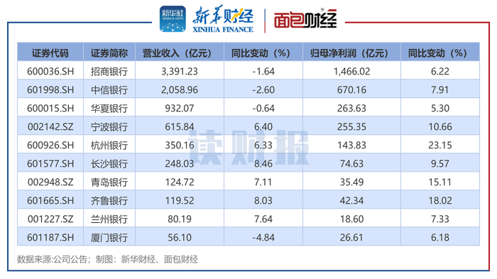 整体来看,10家上市银行归母净利润均实现增长,其中,4家银行实现归母净利润双位数增长。但营收方面,有4家银行的营收同比出现下降,其中厦门银行的降幅相对较高。