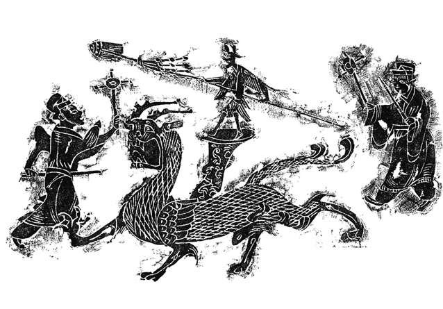 沂南汉墓画像石《乐舞百戏图》局部——龙戏。
