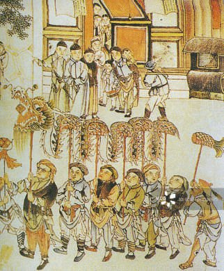 根据《通典》记载,唐代舞龙的配色、大小和配置与汉代类似。祭祀求雨时,唐代的舞龙仪式更加多样,烛龙、水龙等舞龙的变种形态百出。张九龄曾经作《奉和圣制烛龙斋祭》诗,烛龙大概与现在民间表演的火龙相似。兵部员外郎李约的《观祈雨》用对比的手法,描述了遭受旱情严重侵扰的农民在水庙前舞龙求雨的情形。