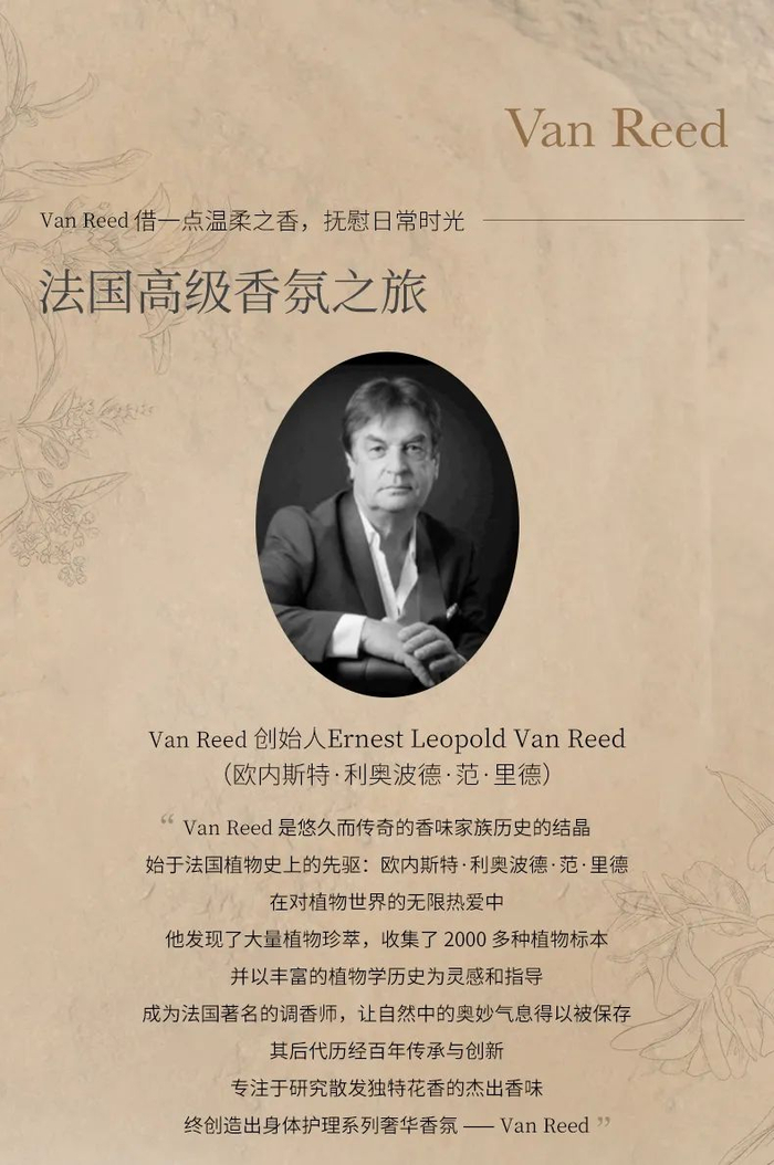 Van Reed创始人是法国著名调香师欧内斯特·利奥波德,在各国游历期间的调香成果和香氛融入产品中。