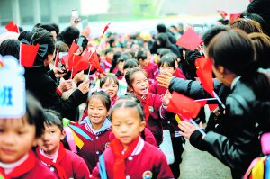 在通过彩虹门的途中,孩子们和道路两侧的家长、嘉宾快乐击掌。