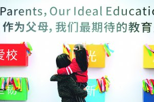 一名家长抱着孩子了解人大附小的“爱校、阳光、厚德、坚韧、创新、包容、凝聚”七彩精神。