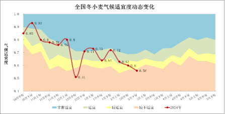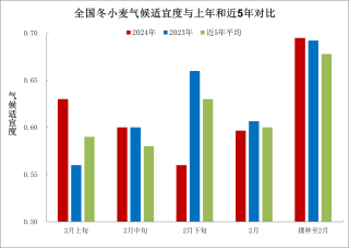 播种以来至2月,全国冬小麦平均气候适宜度为0.72,为适宜,高于上年同期和近5年平均。其中,2月全国冬小麦平均气候适宜度为0.60,与上年基本持平、比近5年平均偏低0.01,适宜度等级为较适宜,其中上旬为适宜,中旬为较适宜,下旬为较不适宜(图7)。