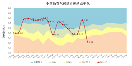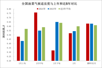 播种以来至2月,全国油菜平均气候适宜度为0.63,为非常适宜,与上年同期持平,比近5年平均高0.02。其中,2月全国油菜平均气候适宜度为0.52,分别较上年和近5年平均低0.02和0.08,适宜度等级为较适宜,其中上旬为较适宜,中旬为非常适宜,下旬为较不适宜(图8)。