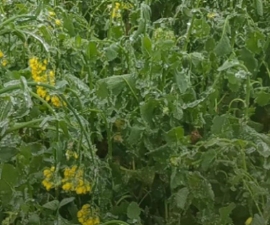 图5、湖北荆州小麦叶片结冰(左)和湖南长沙开花油菜顶部弯折(右)