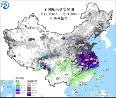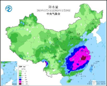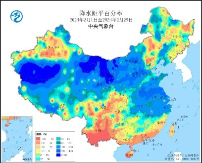 图2全国降水量与降水距平百分率图(2024年2月1日至2月29日)