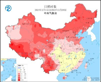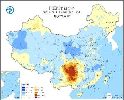 图3全国日照时数与日照距平百分率图(2024年2月1日至2月29日)