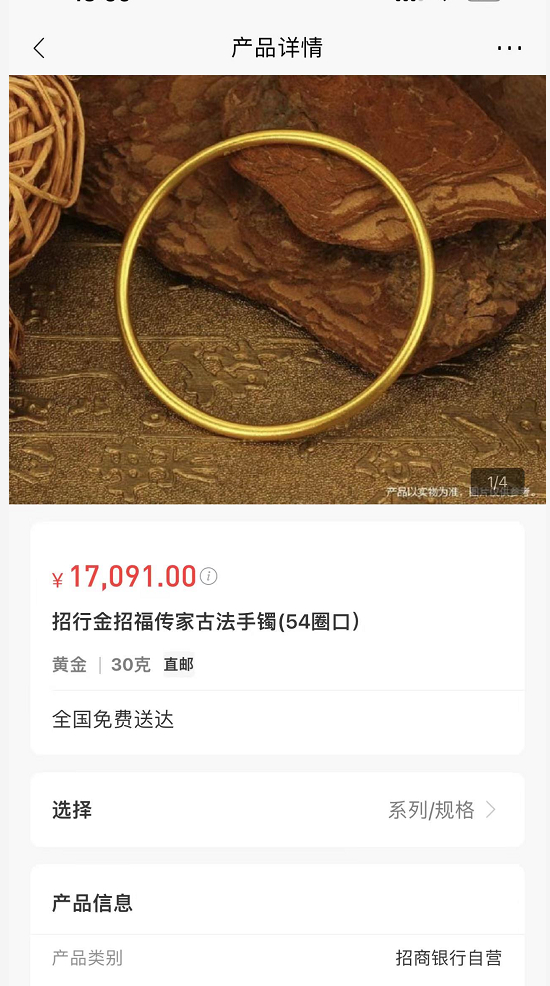 比如,在招商银行的app上,一款招行金招福传家古法手镯重30克,3月4日每件标价17091元,均价为569.70元/克。