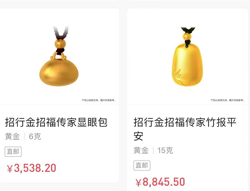 再比如,一款招行金招福传家显眼包吊坠重6克,3月4日售价3538.20元,另一款招行金招福传家竹报平安吊坠重15克,同日售价8845.50元,单价均不足600元/克。
