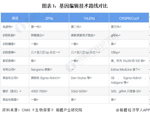 较为常用的基因编辑技术主要为ZFN技术、TALEN技术以及CRISPR/Cas9技术,依此为第一代、第二代、第三代基因编辑技术。从操作应用方面,识别精度、识别效率、剪切效率逐渐提升,成本逐渐下降,商业化程度逐渐提升。