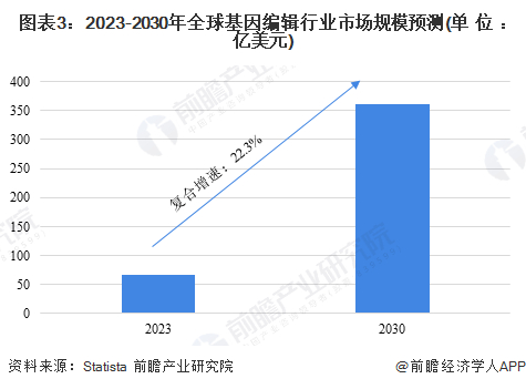 根据Statista统计,2023年至2030年,全球基因编辑行业市场规模将以22.3%的复合增速进行增长,2023年市场规模约为66.19亿美元,到2030年,预计达到360.61亿美元。