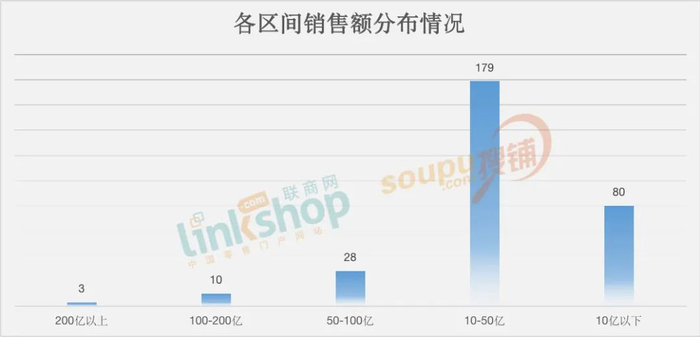 10-50亿区间占比多主要是因为一站式综合性购物中心模式是当下主流商业形态,这些大众时尚型商场有一定的体量,在区域有一定的影响力,加上日常频繁的营销活动,往往有相对不错的销售额,是20亿和30亿军团的主力。同时,对多数商场而言,50亿的门槛也比较难突破,一旦突破50亿,就有机会晋升城市影响力的市级购物中心。