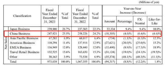 在2023年上半年,中国还是资生堂的第一大市场。但是随着第三和第四季度的持续下跌,中国市场退居第二,全年仅为资生堂带来2479亿日元销售额,同比2022年的2582亿日元下滑4%。