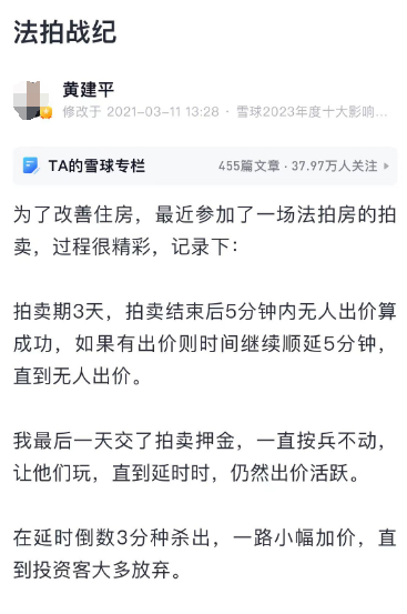 2021年3月11日,黄建平发了一篇《法拍战纪》的帖子来讲述自己是如何在法拍房拍卖过程中,使出绝招逼退一众投资客,用良好的心理素质击退其他对手的。