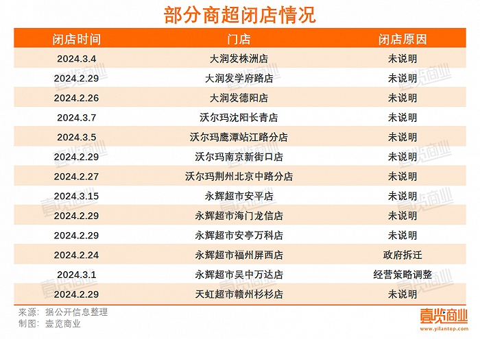 闭店并不是个例,壹览商业独家统计了连锁商超开年以来的经营情况,发现有4家超市品牌关闭了10余家门店。2024年,商超行业着实难过。