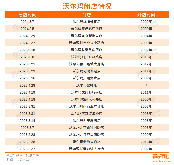 2月29日,沈阳沃尔玛长青店突发公告称,将于3月7日停止营业。事实上,沃尔玛并非只关闭了一家门店:沃尔玛荆州北京中路店2月27日停业;沃尔玛南京首店于2月29日起停止营业;江西鹰潭沃尔玛超市3月5日起停止营业。壹览商业独家统计了自2023年以来的沃尔玛闭店情况,发现一年时间内,沃尔玛至少关闭了19家门店,其中15家为10年以上的老店。