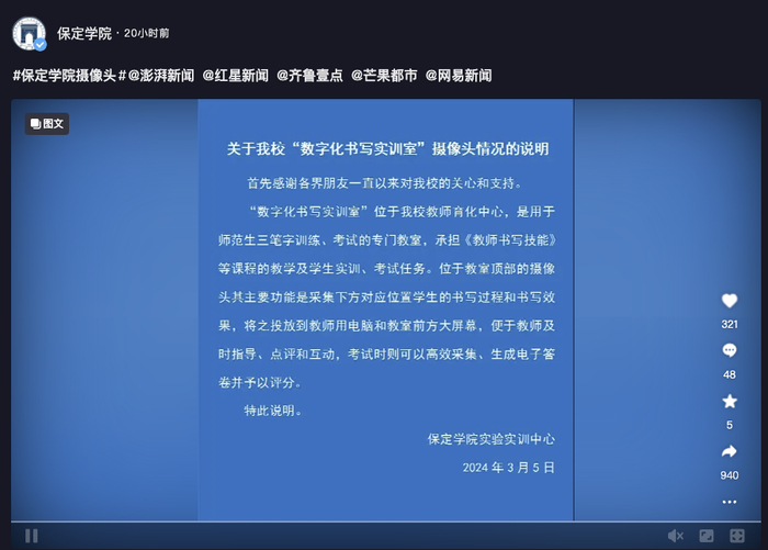 保定学院通报“教室布满摄像头”:便于教师及时指导、点评和互动