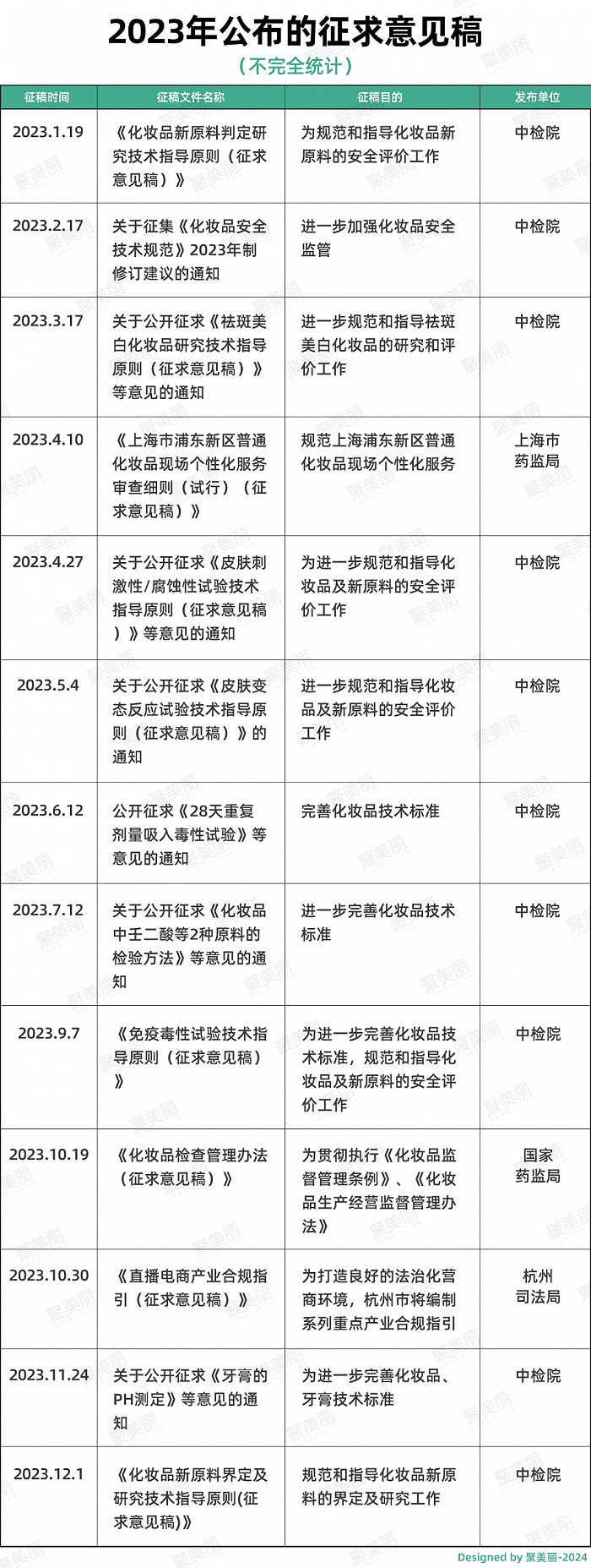 另外,据聚美丽不完全统计,2023年国家药监局、中检院还发布了47个意见征稿,目前还处于编写阶段,内容包括原料检验技术、防晒PFA检测技术等。