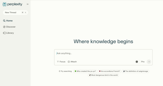 打开Perplexity,你或许会误以为这是一款与ChatGPT或者Claude类似的AI聊天机器人,主要由左边的标签栏和右边的搜索框组成,用户可以在搜索框里搜任何你想知道的东西。