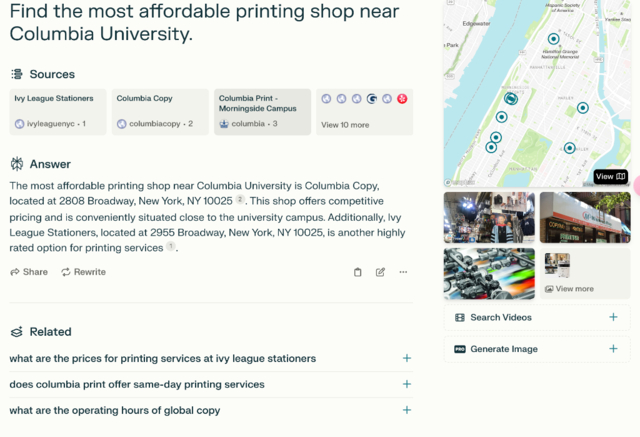 比如,当让Perplexity帮忙找哥伦比亚大学附近最实惠的打印店时,Perplexity很快提供了20个引用来源并筛选出6家门店。每家都尽可能附带了官网、地址和业务范围。