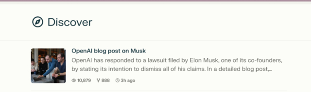 除了搜索外,Perplexity AI还提供了“发现”板块,展示最近比较热门的新闻,比如,今日发稿之时最火的话题为OpenAI官方回应马斯克的博客。