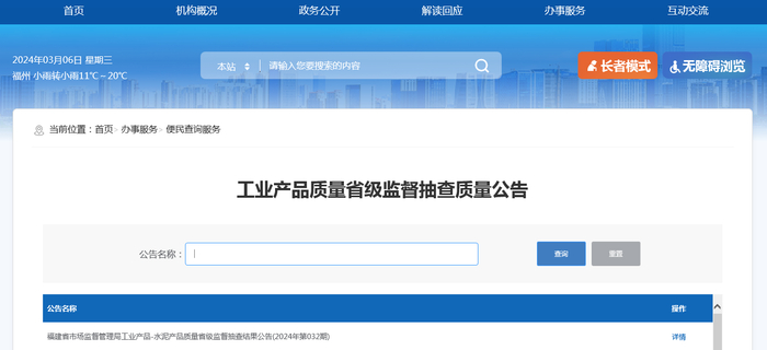 福建省市场监督管理局工业产品-水泥产品质量省级监督抽查结果公告(2024年第032期)